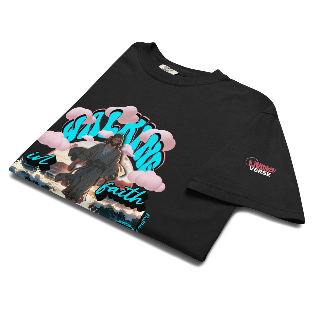 A bold expression of faith with striking, Bible-inspired designs. This piece features Matthew 14:29-31, "He said, ‘Come.’ So Peter got out of the boat and walked on the water and came to Jesus. But when he saw the wind, he was afraid, and beginning to sink he cried out, ‘Lord, save me.’ Jesus immediately reached out his hand and took hold of him, saying to him, ‘O you of little faith, why did you doubt?’"